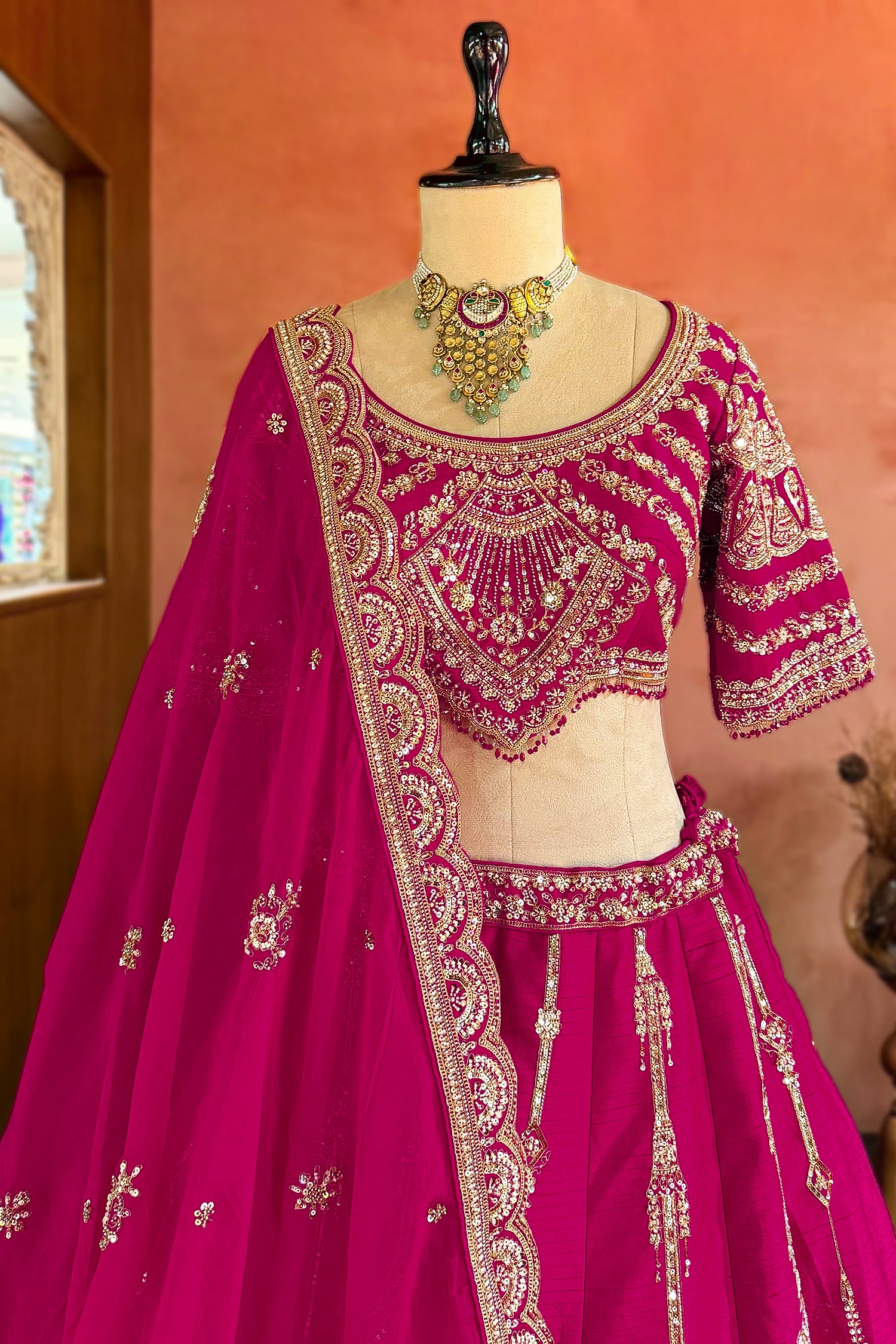 This Rani Pink Raw Silk Lehenga is a vibrant masterpiece of modern heritage. The skirt features vertical linear "Jhumka" and "Chandelier" motifs, hand-worked with an intense fusion of sequins, cutdana, and glass beads. The blouse is a designer standout, featuring a plunging U-neckline and a sharp, scalloped "V" hemline that mirrors the architectural curves of the lehenga. The Double Dupatta system—a sheer organza for the shoulder and a light net for the veil—ensures a layered, three-dimensional look that captures the light from every angle.