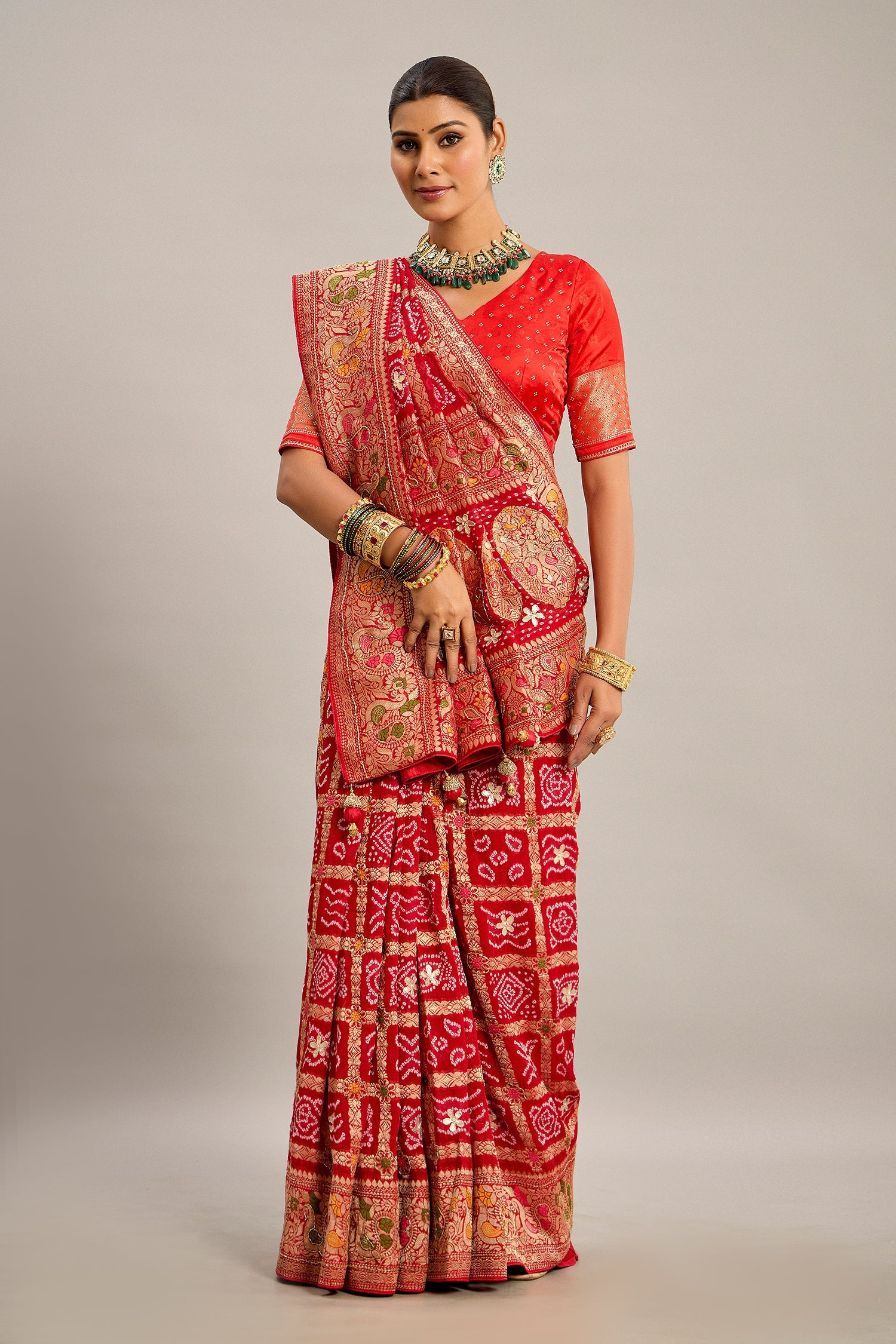 Drape yourself in traditional splendour with our Red Georgette Checks Bandhej Saree with Pitta and Cutdana Work—a vibrant celebration of heritage craft and modern embellishment. Ideal for sangeets, daytime wedding functions, or festive gatherings that need a splash of cultural elegance.