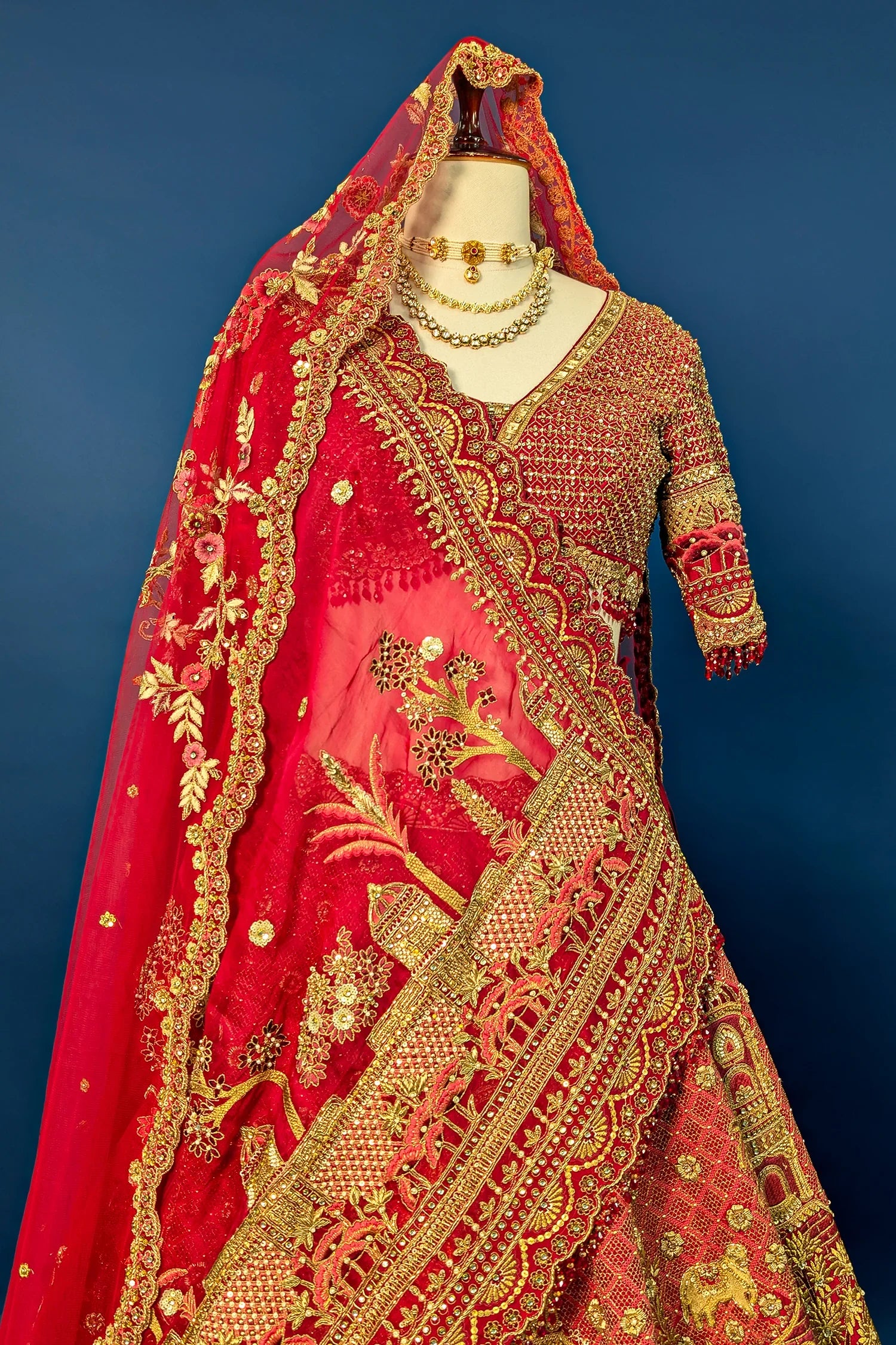 This Red Matka Silk Designer Bridal Lehenga is a breathtaking masterpiece of bridal couture, featuring extensive traditional hand-embroidery and artisanal storytelling. The voluminous skirt is meticulously adorned with architectural motifs, doli scenes, and animal figures, all brought to life through intricate zari and threadwork. It is paired with a heavily embellished blouse and a sophisticated double dupatta styling, where a rich red veil with a scalloped border complements the regal silhouette. Crafted from premium Matka Silk, this ensemble offers a structured, royal feel that makes it the ultimate choice for a grand wedding ceremony.