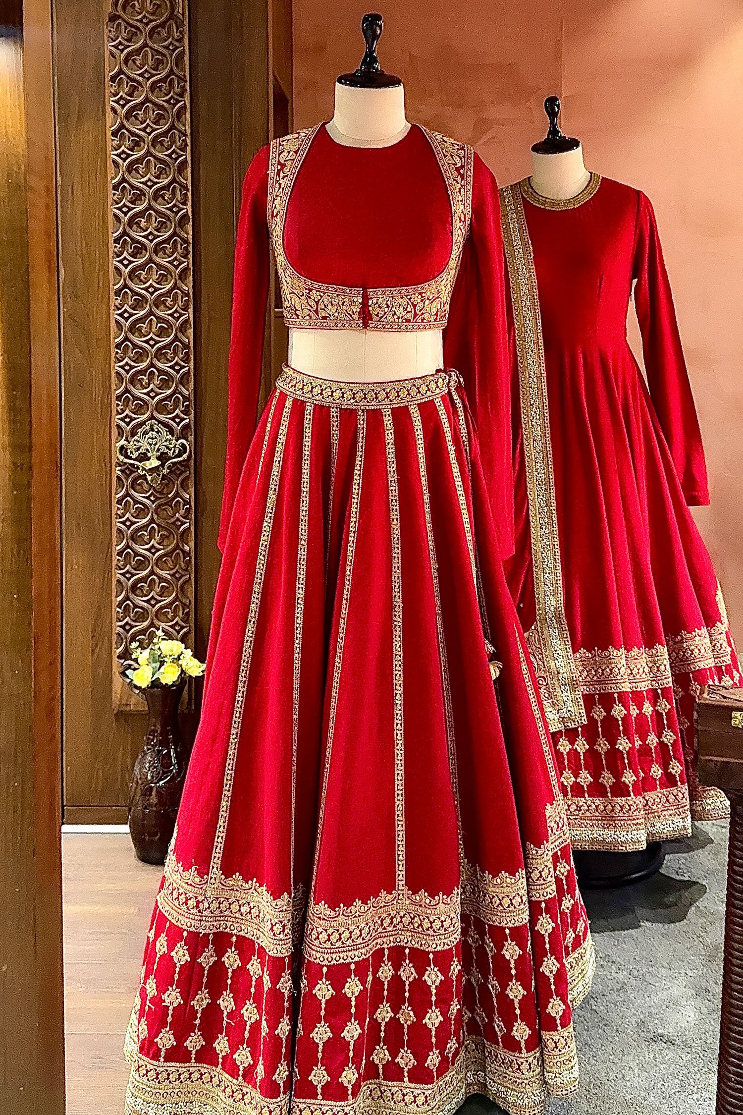 A: The Koti (Jacket) adds a modern layered silhouette to the traditional lehenga and is heavily embroidered to give a rich, 3D look.