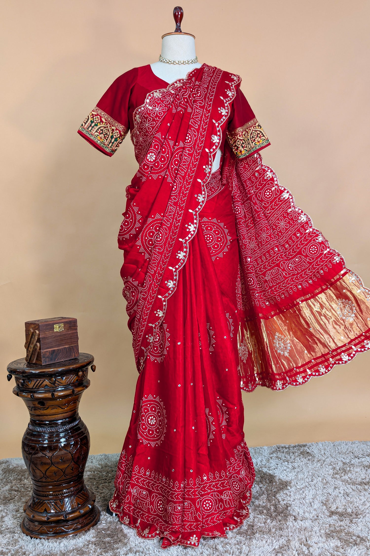 Product Code=PSAGH2003 Color=Red Fabric=Silk Work=Ajrakh-Print, Gora-Patti, Applique Blouse_Color=Red Blouse_Fabric=Silk Blouse_Type=Unstitched Time to Dispatch=25 to 30 Working days
