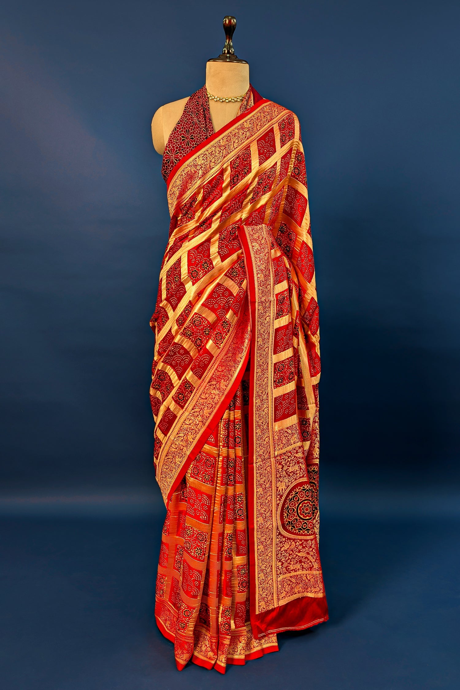 Embrace timeless heritage with this Red Modal Silk Saree, featuring a sophisticated interplay of Ajrakh prints and traditional check patterns. The luxurious modal silk fabric offers a soft feel and an elegant drape, highlighted by a rich red palette and intricate artisanal borders. Perfectly blending ethnic craftsmanship with modern comfort, this saree is ideal for cultural events, festive gatherings, or formal occasions. Complete with an unstitched blouse piece, this ensemble exudes unmatched luxury and refined elegance.