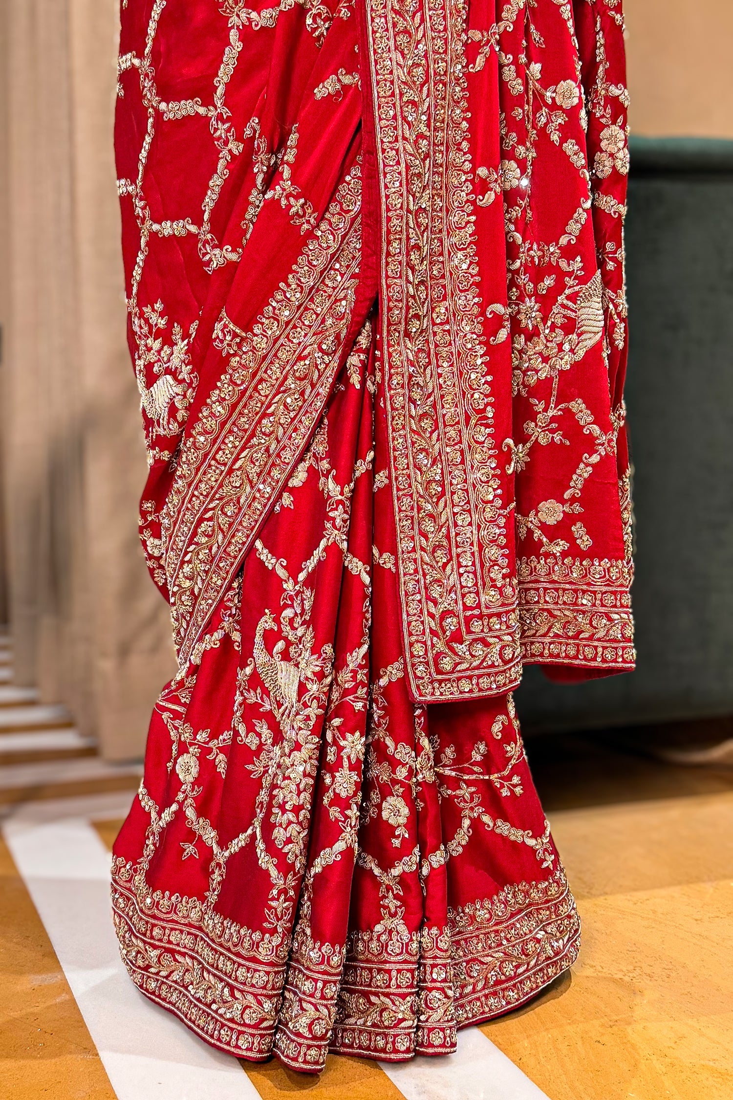 Bold, opulent, and exquisitely handcrafted, this Red Satin Silk Designer Saree is a celebration of artistry and grandeur. The rich satin silk fabric lends a luminous sheen and fluid fall, making it perfect for occasions where elegance must speak effortlessly. The saree is beautifully embellished with intricate zardosi craftsmanship, highlighted with shimmering sequins that illuminate every motif. Delicate florals, ornate vines, and statement patterns flow harmoniously across the body, adding depth and dimension. The intricately embroidered border enhances its luxurious appeal, giving the drape a defined and regal finish. Complete with an unstitched blouse piece, this ensemble exudes unmatched luxury and refined elegance.