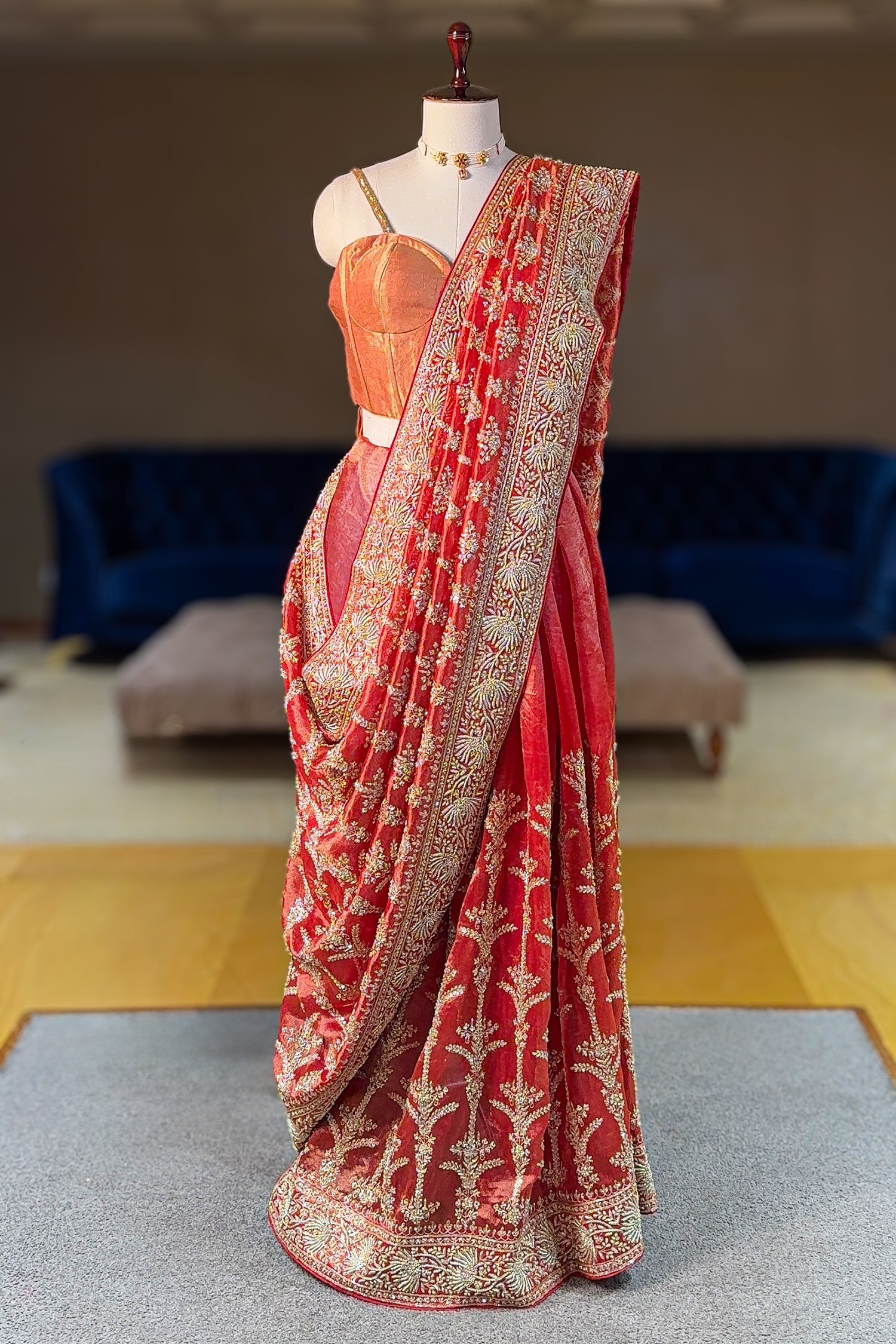 Graceful, airy, and exquisitely embellished, this Rust Orange Organza Saree embodies the beauty of fine craftsmanship on a lightweight, ethereal base. The sheer organza fabric offers a soft, floaty drape, while its natural sheen enhances the richness of the rust orange hue. Intricate zardosi work sprawls across the saree in striking patterned motifs, highlighted with delicate sequins and thread accents that add gentle sparkle. The detailed border frames the saree beautifully, lending a refined, structured finish that elevates its festive grandeur. Complete with an unstitched blouse piece, this ensemble exudes unmatched luxury and refined elegance.