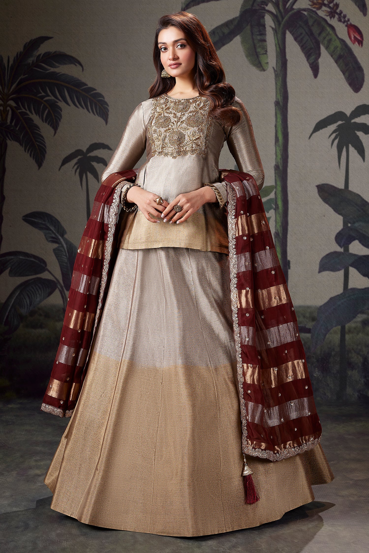 This elegant ensemble features a stunning silver and golden ombre lehenga crafted from shimmering tissue fabric, offering a sophisticated gradient effect. The long top is meticulously adorned with intricate Zardosi work across the neckline and bodice, adding a touch of traditional luxury and texture. Complementing the metallic tones, a deep maroon striped dupatta with delicate borders provides a bold, regal contrast. Designed for festive occasions, this outfit beautifully blends modern silhouettes with timeless craftsmanship, creating a radiant and statuesque look.