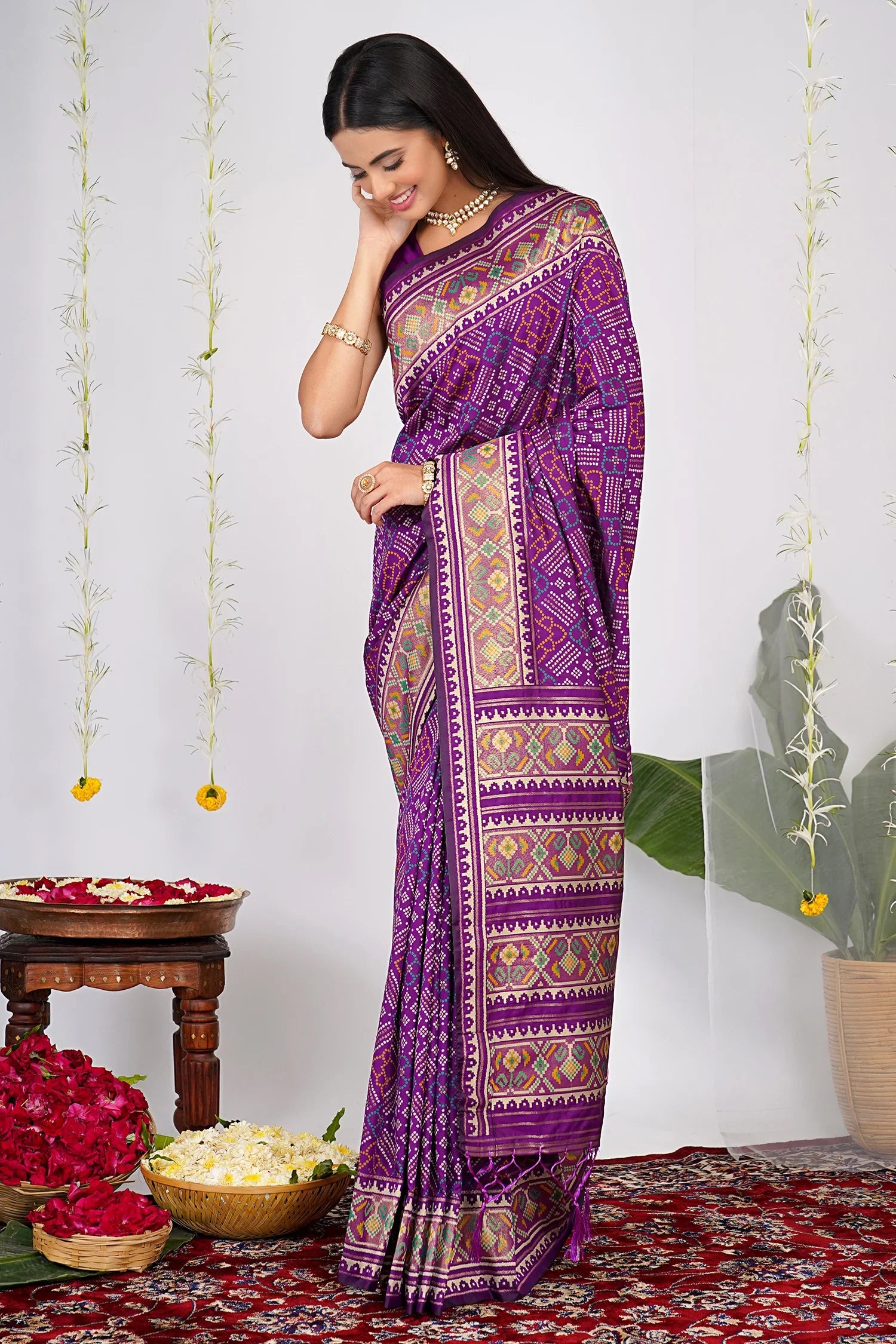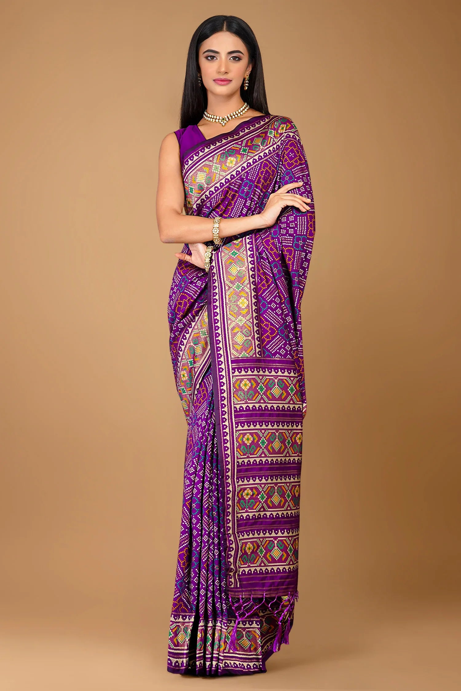 Crafted from premium silk using the revered Patola (double ikat) technique of Patan, Gujarat, this saree features pre-dyed warp and weft threads layered with rich violet tones. The double ikat process creates vibrant, intricate motifs that shine with cultural depth.