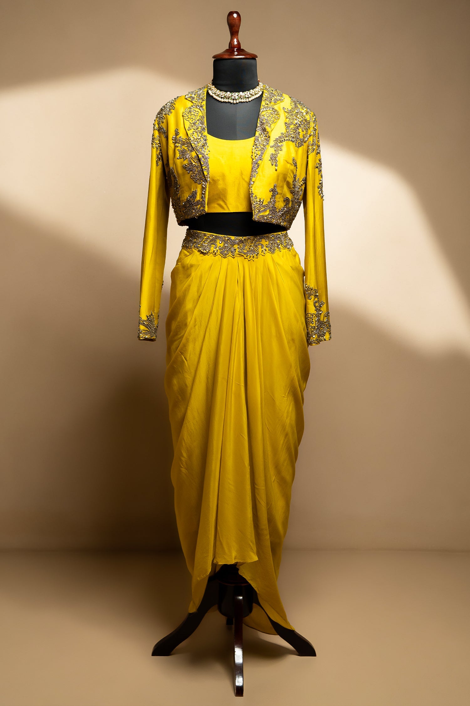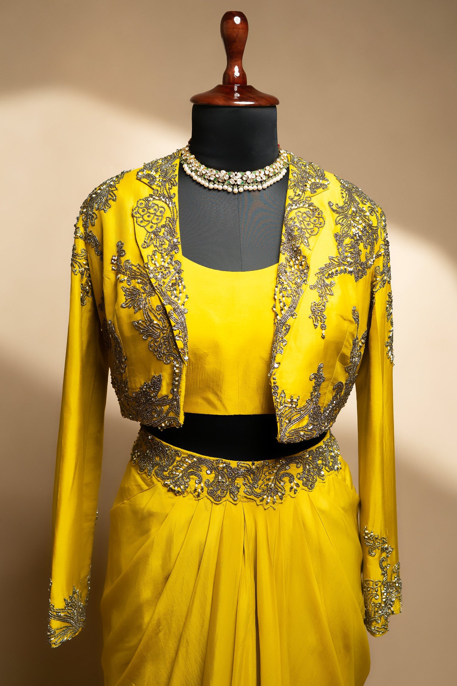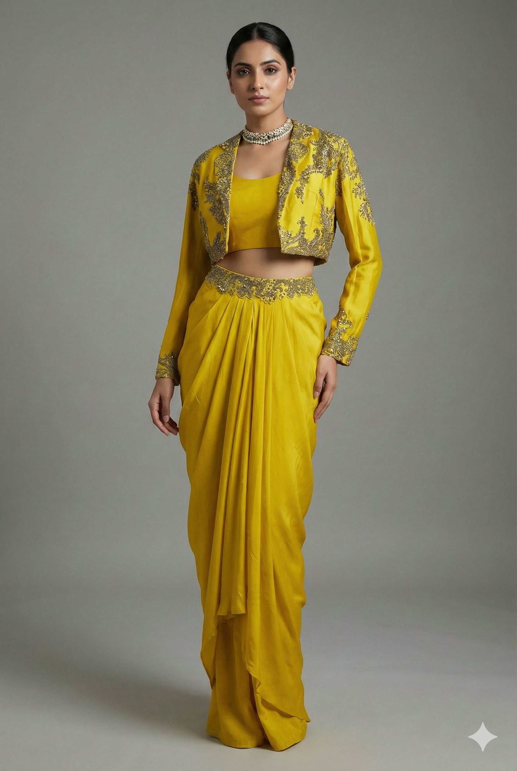 Make a striking style statement with this vibrant yellow designer set, thoughtfully crafted to blend contemporary charm with regal detailing. The look features a sleek, minimal crop top paired with a beautifully draped skirt, offering a rich, luminous fall that enhances every step with effortless elegance.Adding depth and grandeur to the ensemble is the full-sleeved short jacket, intricately embellished with fine beadwork, cutdana highlights, and delicate handcrafted motifs. The detailed embroidery along the sleeves and hem perfectly complements the ornate waistband of the skirt, creating a cohesive and refined silhouette